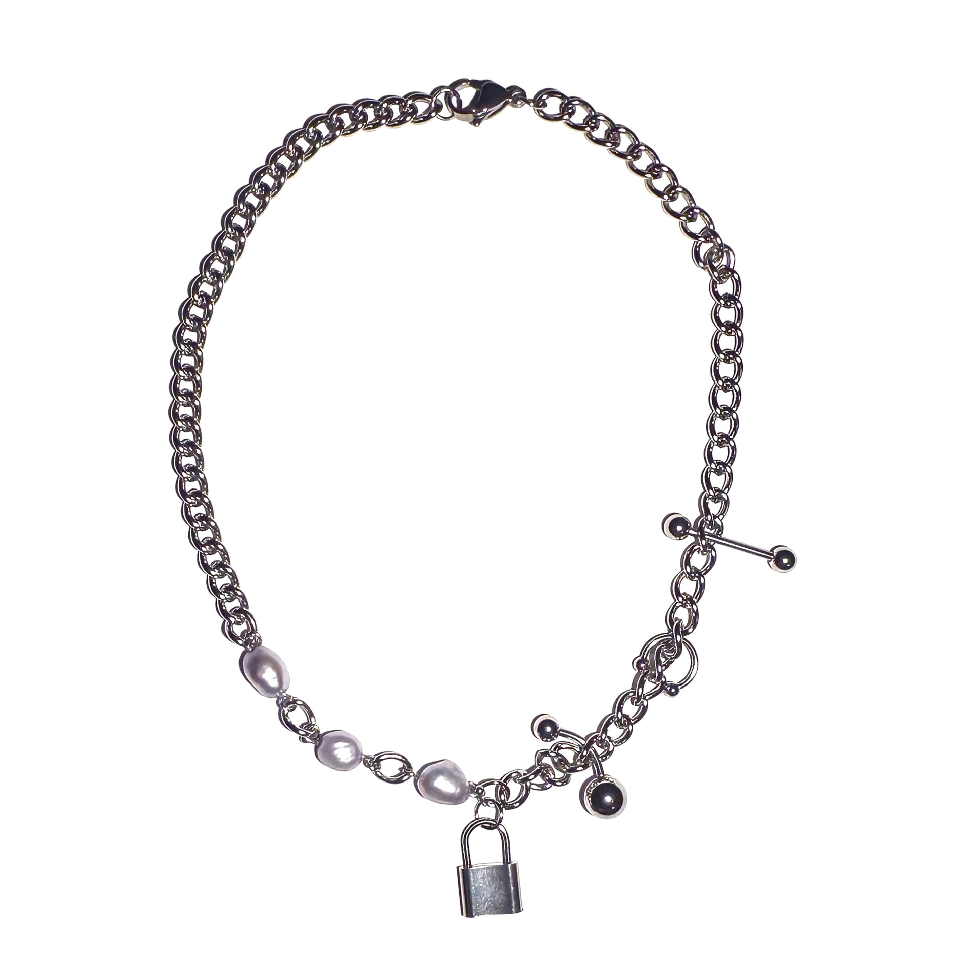 stainless steel necklace with lilac freshwater pearls and lock centerpiece